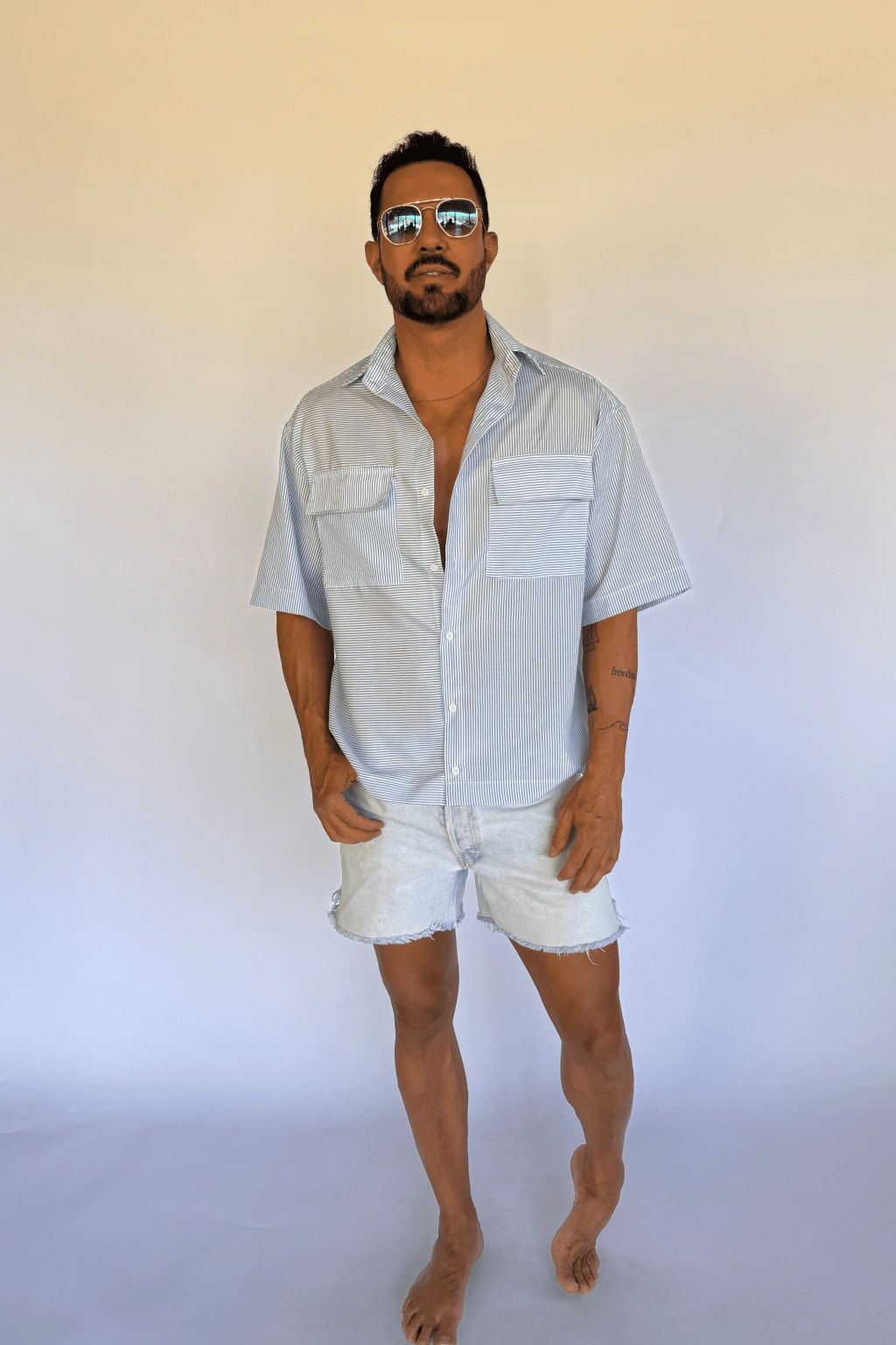 Camisa Atlantica: o oversized que faz toda a diferença! Super tendência, com comprimento mais curto e um design único de listras que se alternam entre horizontal e vertical, tanto no corpo quanto nos bolsos. Feita com uma mistura confortável e resistente de 70% poliéster e 30% algodão, essa peça é perfeita para quem busca estilo e originalidade