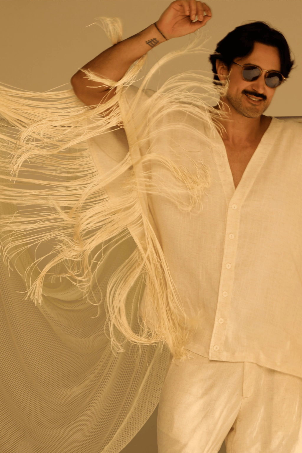 Na cor cru, com franjas longas de 20cm, ele une sofisticação, liberdade e movimento em uma peça única.